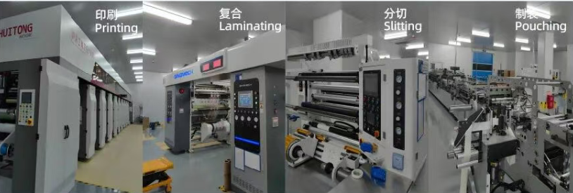 【设备先进】:拥有汇通9色高速印刷机、通泽无溶剂复合机、分切机、汇通制袋机等先进生产设备及各类检测仪,确保高效、精准的生产流程。